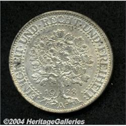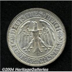 <B>Weimar Republic. Oaktree 5 Mark 1928-A,</B></I> KM56 AU. <BR><BR><B>Important notice:</B> Heritage usually auctions material at the rate of 200-250 lots per hour. On some occasions eBay Live bid software or the Internet may not be able to keep up with the pace of the auction. We recommend placing a realistic absentee bid now as insurance to avoid disappointment. Occasionally the auctioneer may eliminate or reject an eBay Live bid, and the auctioneer may also reopen a lot after the close of the eBay live bidding (usually because we missed an audience bid), and may reject your bid even if it shows you as the winning bidder. By bidding via eBay Live, you agree that Heritage may award the lot to another bidder at its sole discretion under the circumstances described above or any other reasonable circumstances. Since eBay bids are not shown to us until we open the lot on the floor, we treat those bids just like floor bids. In most cases the floor responds before the eBay bid is presented to us, due to Internet lag time, so for consistency we have made it a policy that floor bids are always considered first over tie eBay live bids. Also please note that all Heritage lots purchased through eBay Live carry a 20% Buyer's Premium. Please make sure you read the Terms and Conditions before you bid.