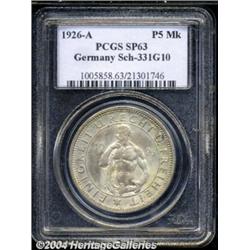 Weimar Republic. Pattern 5 Mark 1926A, Schaaf 331G10, "Unity, Right and Freedom." SP 63 PCGS. Important notice: Heritage usually auctions material at the rate of 200-250 lots per hour. On some occasions eBay Live bid software or the Internet may not be able to keep up with the pace of the auction. We recommend placing a realistic absentee bid now as insurance to avoid disappointment. Occasionally the auctioneer may eliminate or reject an eBay Live bid, and the auctioneer may also reopen a lot after the close of the eBay live bidding (usually because we missed an audience bid), and may reject your bid even if it shows you as the winning bidder. By bidding via eBay Live, you agree that Heritage may award the lot to another bidder at its sole discretion under the circumstances described above or any other reasonable circumstances. Also please note that all Heritage lots purchased through eBay Live carry a 20% Buyer's Premium. Please make sure you read the Terms and Conditions before you bid.