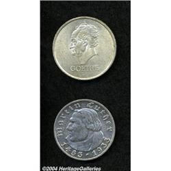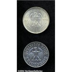 <B>Weimar Republic & Third Reich, </B></I>KM76 Goethe 3 Mark 1932-A, AU small flaw by ear and KM80 Luther 5 Mark 1933-A, AU-BU lightly dipped. 2 coins <BR><BR><B>Important notice:</B> Heritage usually auctions material at the rate of 200-250 lots per hour. On some occasions eBay Live bid software or the Internet may not be able to keep up with the pace of the auction. We recommend placing a realistic absentee bid now as insurance to avoid disappointment. Occasionally the auctioneer may eliminate or reject an eBay Live bid, and the auctioneer may also reopen a lot after the close of the eBay live bidding (usually because we missed an audience bid), and may reject your bid even if it shows you as the winning bidder. By bidding via eBay Live, you agree that Heritage may award the lot to another bidder at its sole discretion under the circumstances described above or any other reasonable circumstances. Since eBay bids are not shown to us until we open the lot on the floor, we treat those bids just like floor bids. In most cases the floor responds before the eBay bid is presented to us, due to Internet lag time, so for consistency we have made it a policy that floor bids are always considered first over tie eBay live bids. Also please note that all Heritage lots purchased through eBay Live carry a 20% Buyer's Premium. Please make sure you read the Terms and Conditions before you bid.