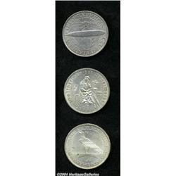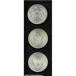 <B>Weimar Republic - Trio, </B></I>KM67 Zeppelin 3 Mark 1930-A, nice AU-UNC, KM69 Vogelweide 3 Mark 1930-A, XF-AU lightly lacquered and KM70 Rhineland Liberation 1930-A, AU-BU, lightly lacquered. 3 coins <BR><BR><B>Important notice:</B> Heritage usually auctions material at the rate of 200-250 lots per hour. On some occasions eBay Live bid software or the Internet may not be able to keep up with the pace of the auction. We recommend placing a realistic absentee bid now as insurance to avoid disappointment. Occasionally the auctioneer may eliminate or reject an eBay Live bid, and the auctioneer may also reopen a lot after the close of the eBay live bidding (usually because we missed an audience bid), and may reject your bid even if it shows you as the winning bidder. By bidding via eBay Live, you agree that Heritage may award the lot to another bidder at its sole discretion under the circumstances described above or any other reasonable circumstances. Since eBay bids are not shown to us until we open the lot on the floor, we treat those bids just like floor bids. In most cases the floor responds before the eBay bid is presented to us, due to Internet lag time, so for consistency we have made it a policy that floor bids are always considered first over tie eBay live bids. Also please note that all Heritage lots purchased through eBay Live carry a 20% Buyer's Premium. Please make sure you read the Terms and Conditions before you bid.