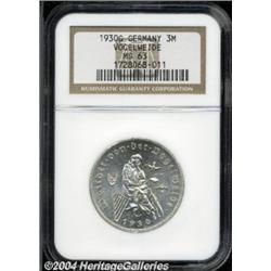 Weimar Republic. Vogelweide 3 Mark 1930G, KM69, MS63 NGC, fully brilliant luster. Important notice: Heritage usually auctions material at the rate of 200-250 lots per hour. On some occasions eBay Live bid software or the Internet may not be able to keep up with the pace of the auction. We recommend placing a realistic absentee bid now as insurance to avoid disappointment. Occasionally the auctioneer may eliminate or reject an eBay Live bid, and the auctioneer may also reopen a lot after the close of the eBay live bidding (usually because we missed an audience bid), and may reject your bid even if it shows you as the winning bidder. By bidding via eBay Live, you agree that Heritage may award the lot to another bidder at its sole discretion under the circumstances described above or any other reasonable circumstances. Also please note that all Heritage lots purchased through eBay Live carry a 20% Buyer's Premium. Please make sure you read the Terms and Conditions before you bid.