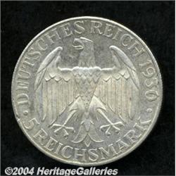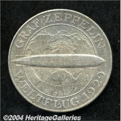 <B>Weimar Republic. Zeppelin 5 Mark 1930-J, </B></I>KM68, nice AU, small rim bump. <BR><BR><B>Important notice:</B> Heritage usually auctions material at the rate of 200-250 lots per hour. On some occasions eBay Live bid software or the Internet may not be able to keep up with the pace of the auction. We recommend placing a realistic absentee bid now as insurance to avoid disappointment. Occasionally the auctioneer may eliminate or reject an eBay Live bid, and the auctioneer may also reopen a lot after the close of the eBay live bidding (usually because we missed an audience bid), and may reject your bid even if it shows you as the winning bidder. By bidding via eBay Live, you agree that Heritage may award the lot to another bidder at its sole discretion under the circumstances described above or any other reasonable circumstances. Since eBay bids are not shown to us until we open the lot on the floor, we treat those bids just like floor bids. In most cases the floor responds before the eBay bid is presented to us, due to Internet lag time, so for consistency we have made it a policy that floor bids are always considered first over tie eBay live bids. Also please note that all Heritage lots purchased through eBay Live carry a 20% Buyer's Premium. Please make sure you read the Terms and Conditions before you bid.