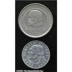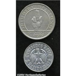 <B>Weimar Republic and Third Reich Pair, </B></I>Hindenburg 5 Mark 1929-J KM64, VF+ minor rim nicks and Luther 5 Mark 1933-D KM80, cleaned VF, two rim nicks, one noticeable. 2 coins <BR><BR><B>Important notice:</B> Heritage usually auctions material at the rate of 200-250 lots per hour. On some occasions eBay Live bid software or the Internet may not be able to keep up with the pace of the auction. We recommend placing a realistic absentee bid now as insurance to avoid disappointment. Occasionally the auctioneer may eliminate or reject an eBay Live bid, and the auctioneer may also reopen a lot after the close of the eBay live bidding (usually because we missed an audience bid), and may reject your bid even if it shows you as the winning bidder. By bidding via eBay Live, you agree that Heritage may award the lot to another bidder at its sole discretion under the circumstances described above or any other reasonable circumstances. Since eBay bids are not shown to us until we open the lot on the floor, we treat those bids just like floor bids. In most cases the floor responds before the eBay bid is presented to us, due to Internet lag time, so for consistency we have made it a policy that floor bids are always considered first over tie eBay live bids. Also please note that all Heritage lots purchased through eBay Live carry a 20% Buyer's Premium. Please make sure you read the Terms and Conditions before you bid.