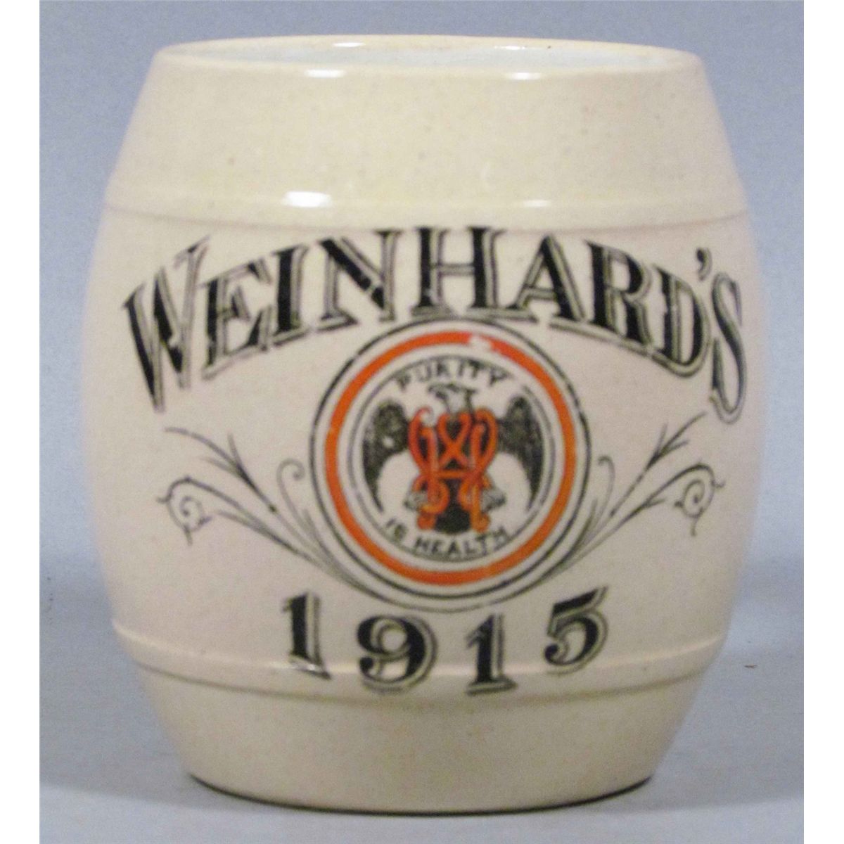 Weinhard's 1915 Beer Mug. 2 very tiny chips on base and normal crazing otherwise excellent condition. 3 3/4 inches tall. Start Price $50