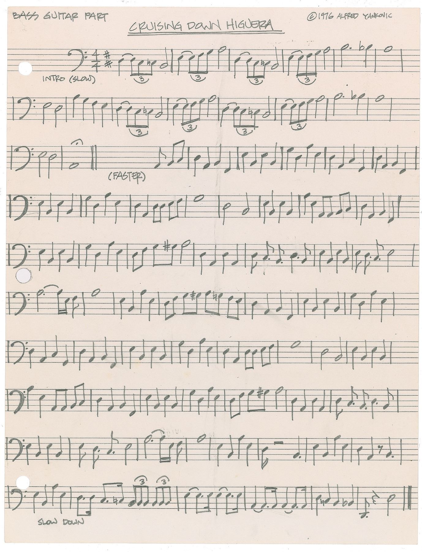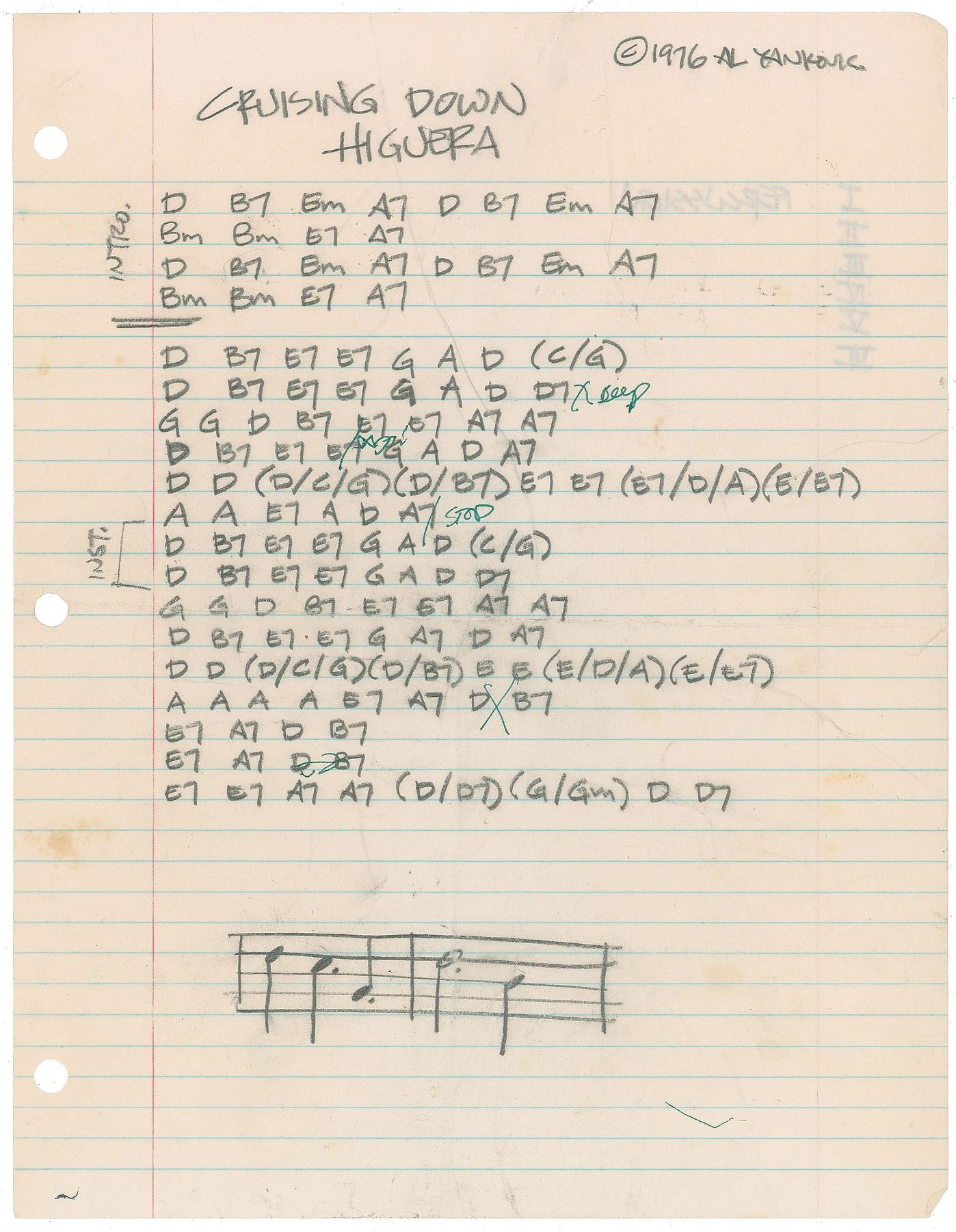 Highly amusing collection of handwritten material from ‘Weird Al’ Yankovic, amounting to 15 pages of sheet music, lyrics, and notes dating between 1976 and 1979. With the exception of one typed lyric sheet, the balance is written in either ink or pencil on notebook sheets ranging in size from 3.75 x 5.5 to 8.5 x 11. The group is highlighted by two sheets containing chord and sheet music for the song “Cruising Down Higuera,“ which Yankovic gave to roommate and fellow musician Jon Iverson for recording and eventual live events. Yankovic has added “Bass Guitar Part” to the upper margin of the sheet music, and both sheets bear his signature with copyright date to upper right corner, “1976 Alfred Yankovic.”