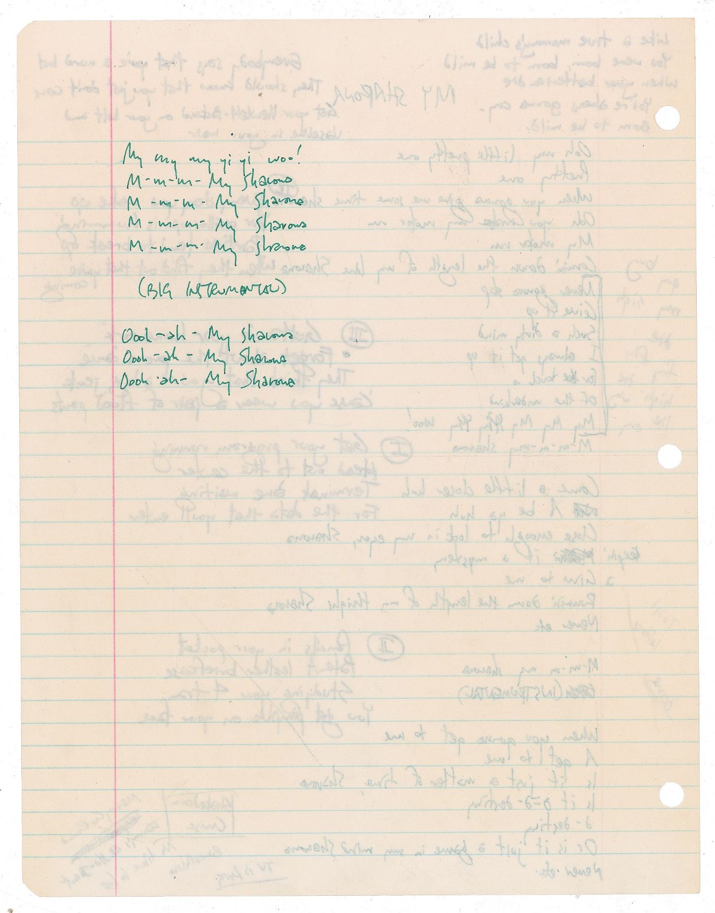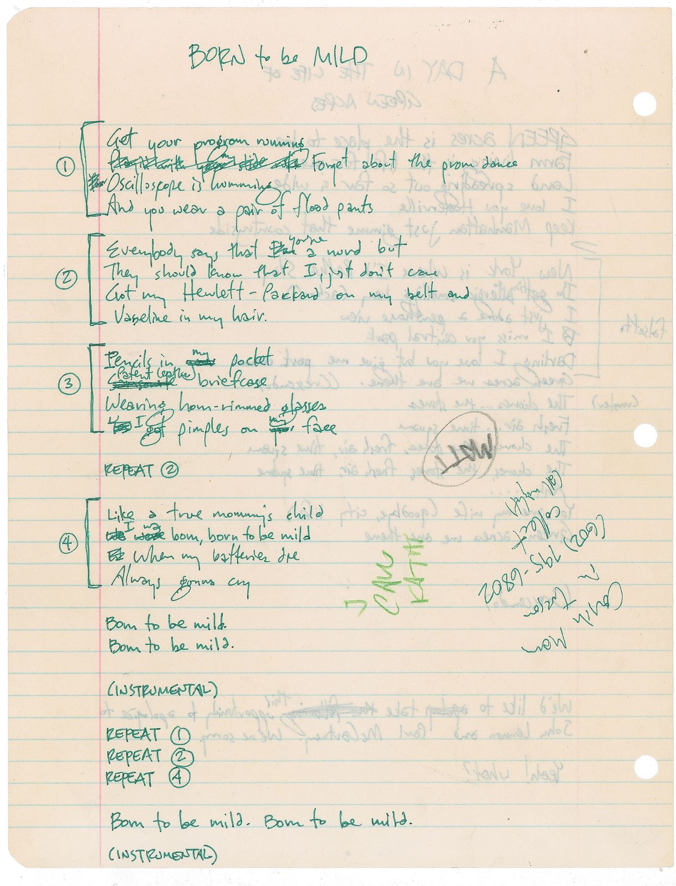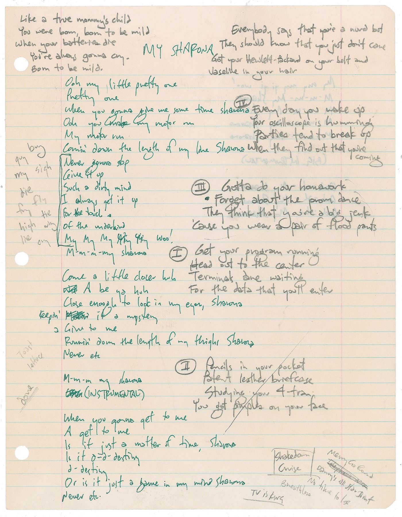 A sheet containing lyrics for the song ‘My Sharona’ by The Knack, as well as parody lyrics for the Yankovic song, ‘Born to Be Mild,' a lampoon of the Steppenwolf song, ‘Born to Be Wild.’ Yankovic transcribed the original ‘My Sharona’ song lyrics as a reference for the final wording and arrangement for ‘My Bologna.’ In the left margin, Yankovic has written down various substitute ‘My’ words for the song, including “buy,” “guy,” “sigh,” “die,” “fry,” “fly,” “high,” “tie,” “lie,” “why,” and “cry.”