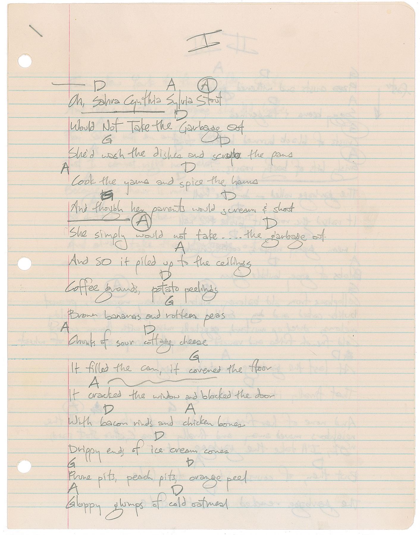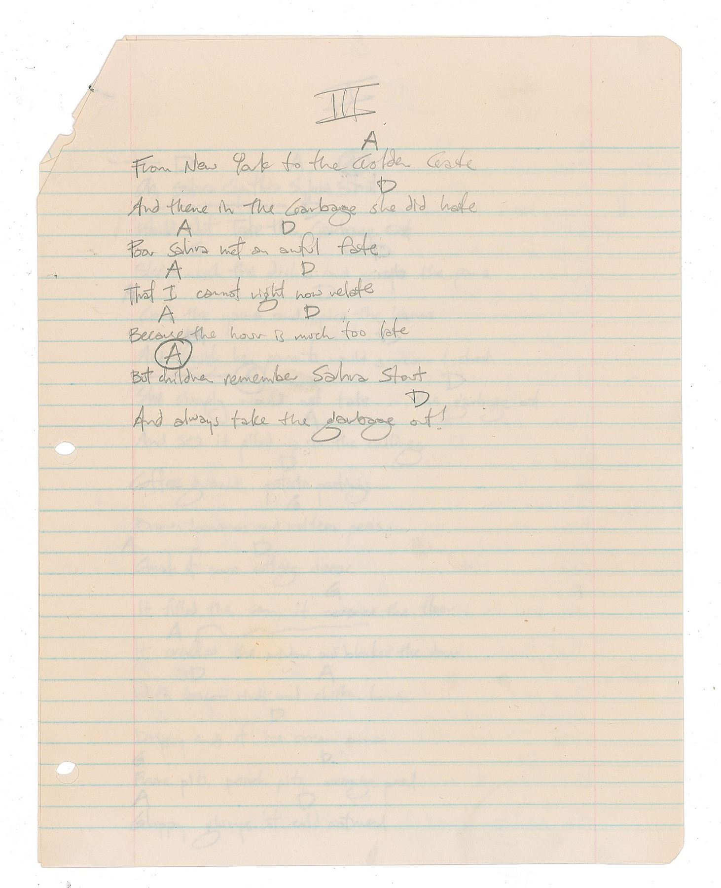 A stapled packet of three sheets containing handwritten lyrics and chords for the Shel Silverstein song/poem ‘Sarah Cynthia Sylvia Stout,’ with Yankovic changing the spelling of the first name to “Sahra.”