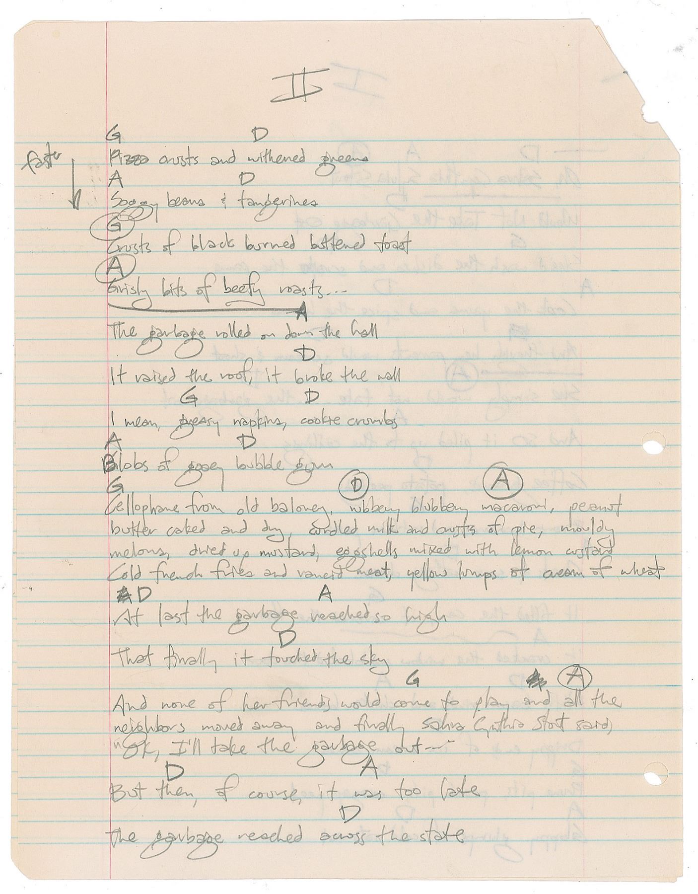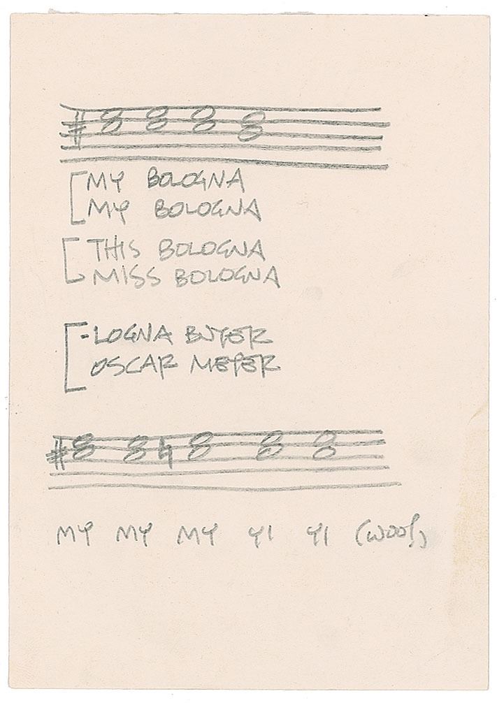 Provenance: The Collection of Jon Iverson, Yankovic's college roommate at Cal Poly, who notes: "We were roommates around 1978–79 and rehearsed and performed together all around San Luis Obispo. Many of the handwritten notes in the set are from our sessions working out lyrics to songs and subsequent parodies of those songs. We originated the idea together of doing parodies of popular songs using a food theme, 'My Bologna' being a famous later example of that approach."