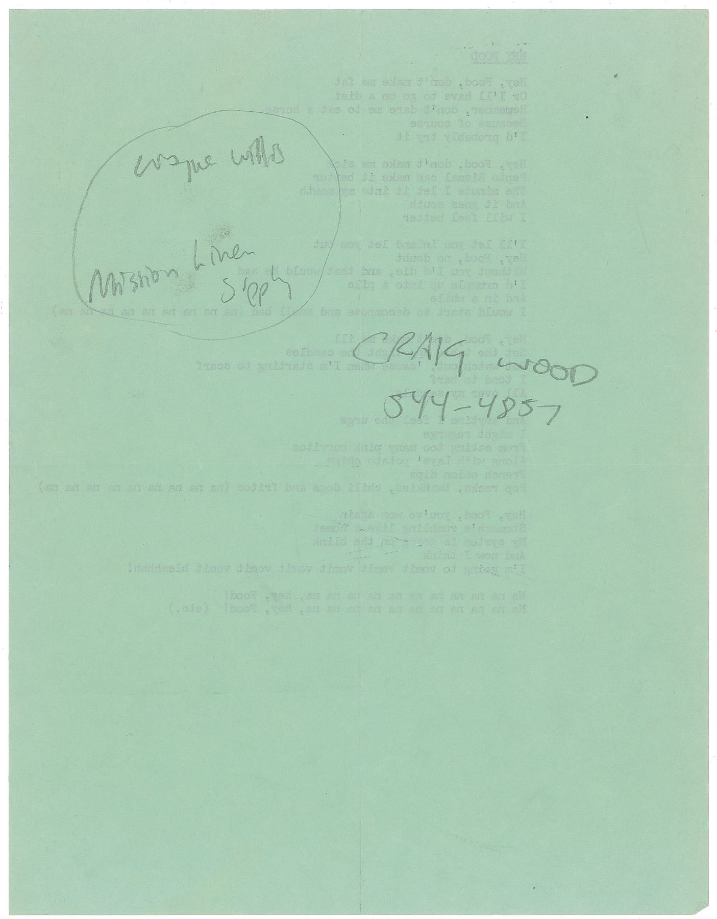 A typed lyric sheet containing words to the song “Hey Food,” a 1979 parody of ‘Hey Jude’ by the Beatles, with one verse reading: “Hey Food, don’t make me ill / Set the table and light the candles / But watch out, ‘cause when I’m starting to scarf / I tend to barf / All over my sandals.”