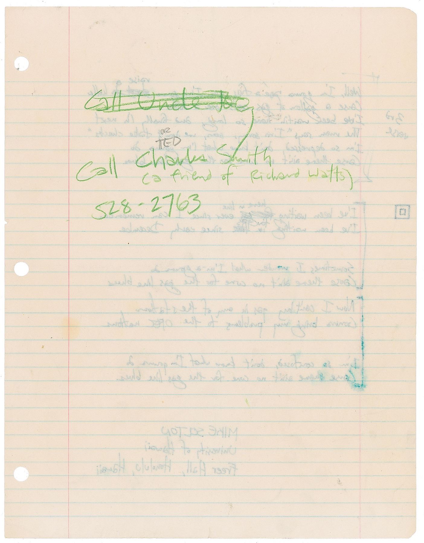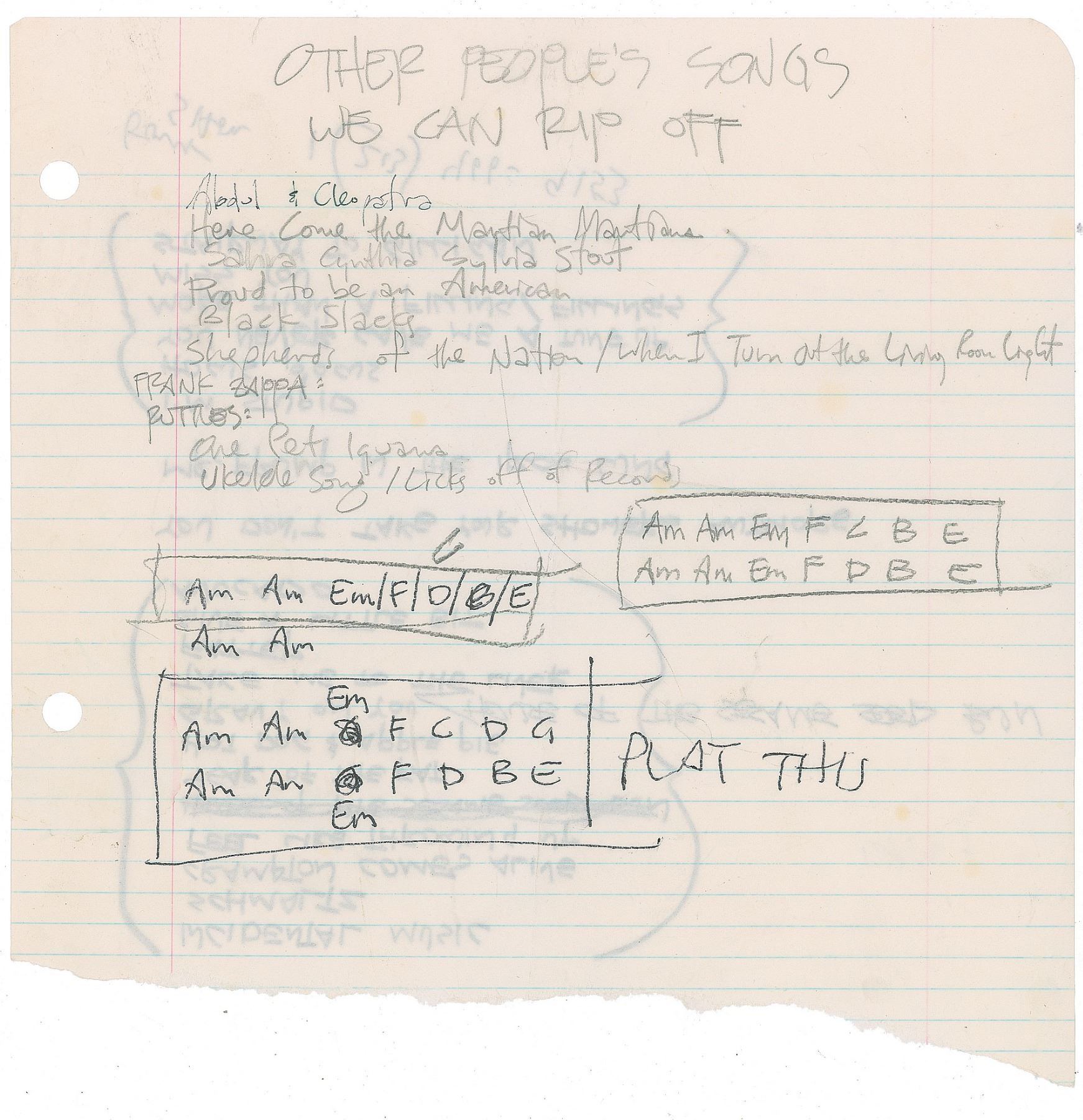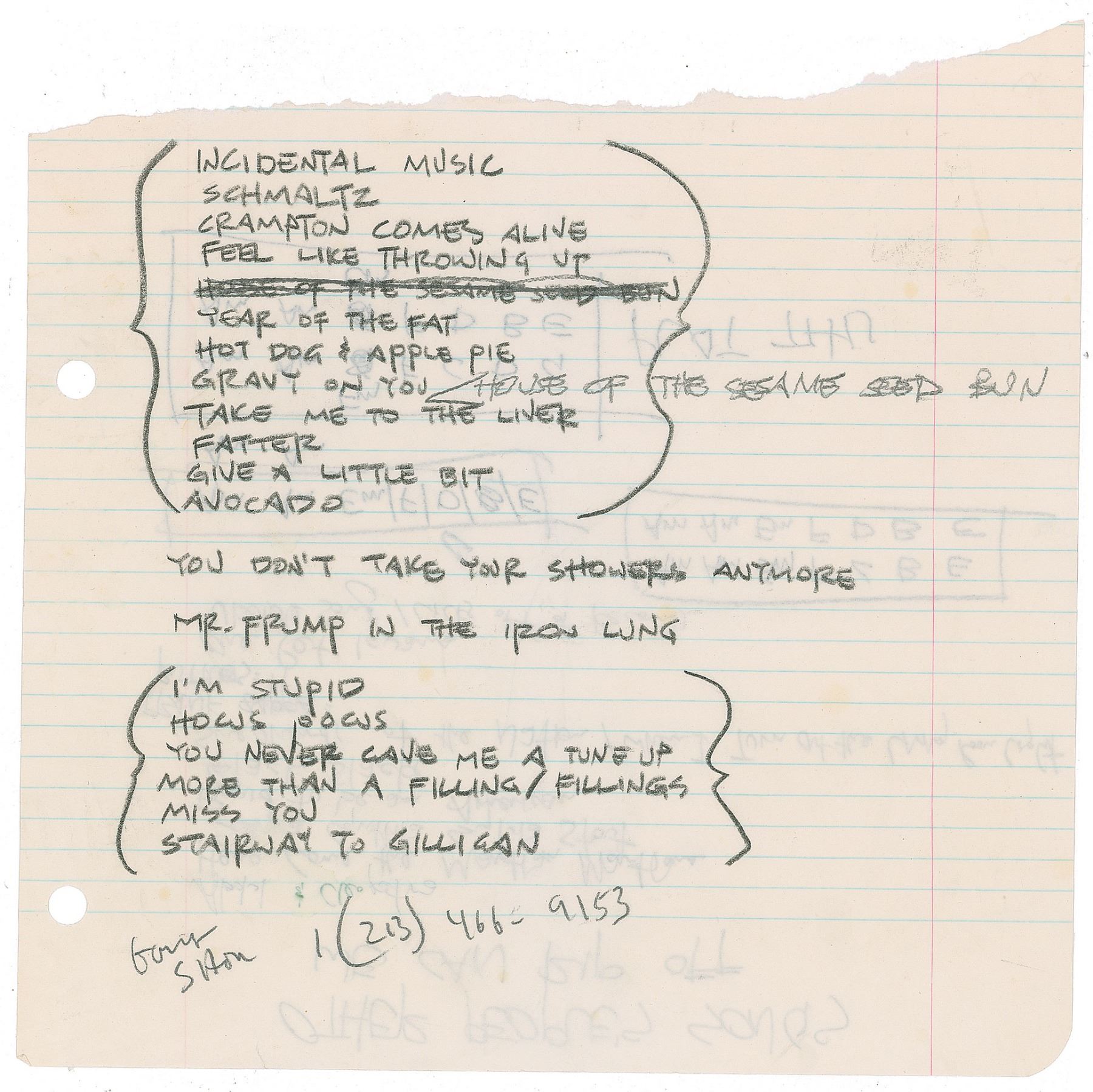A two-sided sheet with one side headed “Other People’s Songs We Can Rip Off,” which features a variety of titles and names, “Abdul & Cleopatra,” “Here Come the Martian Martians,” “Sahra Cynthia Sylvia Stout,” “Proud to be an American,” “Black Slacks,” “Shepherds of the Nation / When I Turn Off The Living Room Light,” “Frank Zappa:,” “Ruttles:,” “One Pet Iguana,” and “Ukelele Song / Licks off of Records,” with an assortment of musical notes added below. The reverse of the sheet features a set list with numerous parody song titles: “Incidental Music,” “Schmaltz,” “Crampton Comes Alive,” “Feel like Throwing Up,” “Year of the Fat,” “Hot Dog & Apple Pie,” “Gravy on You / House of the Sesame Seed Bun,” “Take Me to the Liver,” “Fatter,” “Give a Little Bit,” “Avocado,” “You Don’t Take Your Showers Anymore,” “Mr. Frump in the Iron Lung,” “I’m Stupid,” “Hocus Pocus,” “You never Gave Me a Tune Up,” “More than a Filling/Fillings,” “Miss You,” and “Stairway to Gilligan.” A notation at the very bottom, “Gong Show 1(213) 466-9153,” written in the hand of Jon Iverson, relates to an early Los Angeles audition for Chuck Barris, during which they played the classic song ‘Mr. Frump in the Iron Lung.’