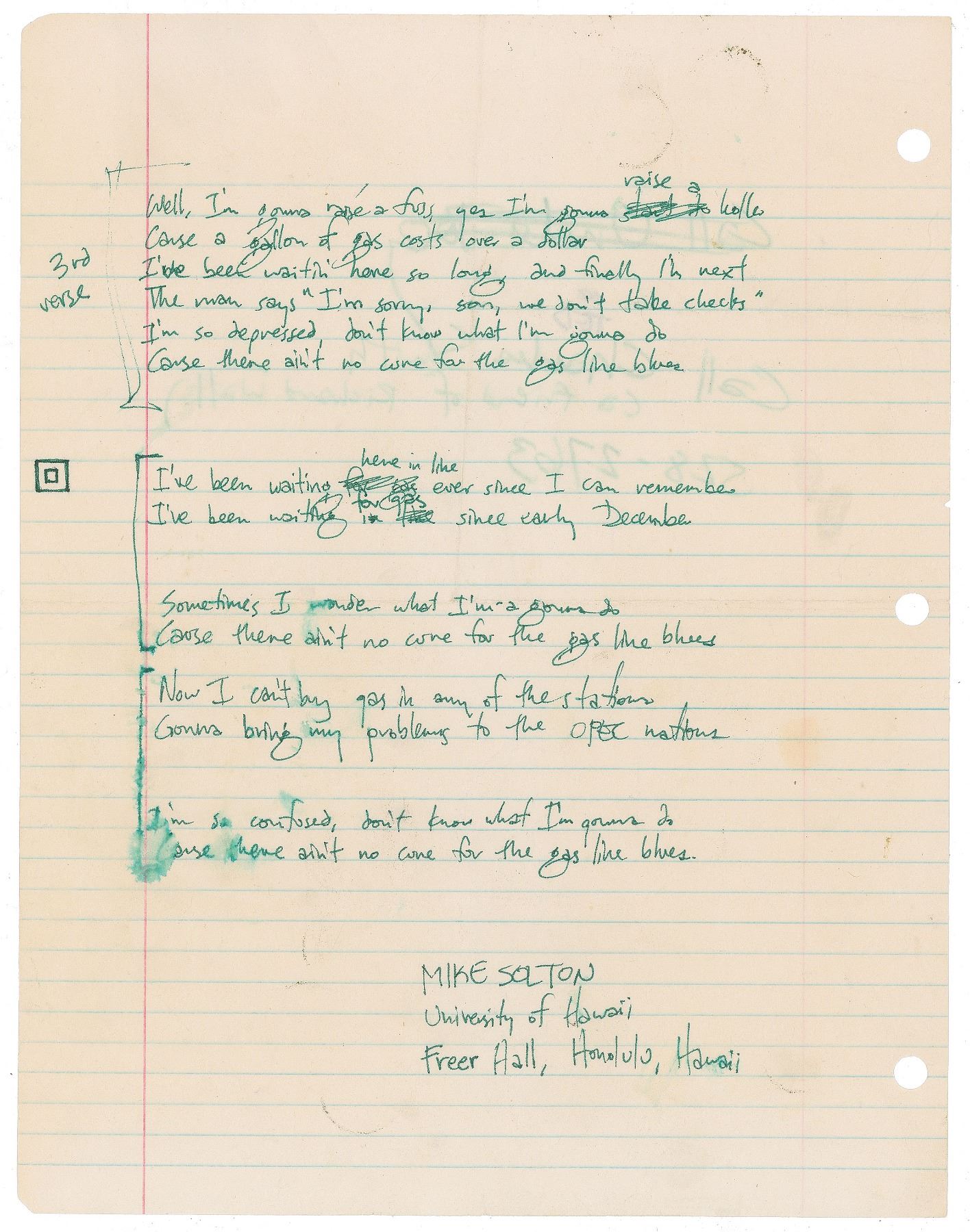 Partial lyrics for a parody song inspired by Eddie Cochran’s ‘Summertime Blues,’ with a section as follows: “Sometimes I wonder what I’m-a gonna do / Cause there ain’t no cure for the gas line blues.” Yankovic wrote ‘The Gas Line Blues’ in response to the 1979 oil crisis when gas prices increased 100% and severely cut into his student budget while attending California Polytechnic State University in San Luis Obispo.