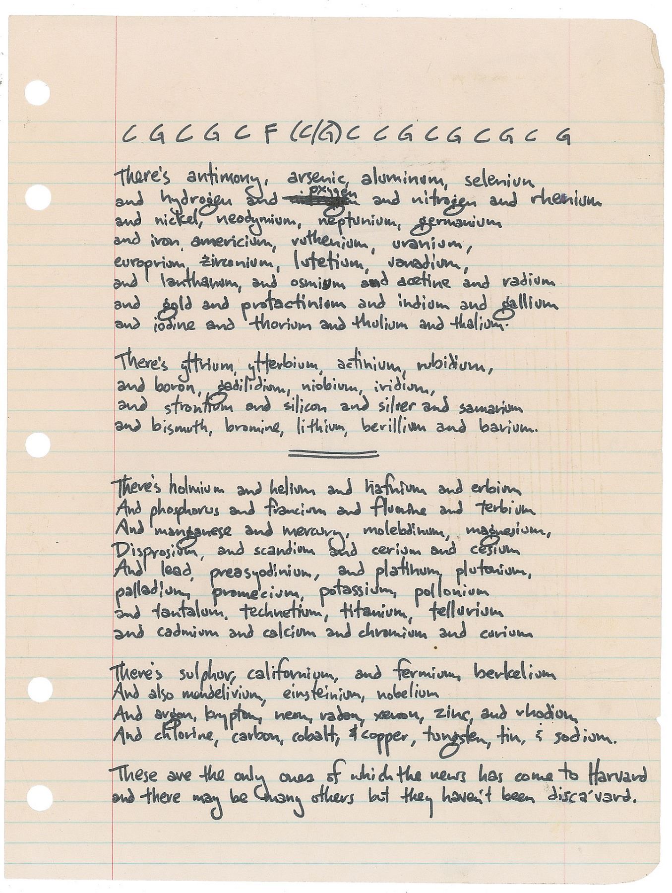 A lyric sheet containing the words to ‘The Elements’ song by musical humorist and lecturer Tom Lehrer, with chords written above.