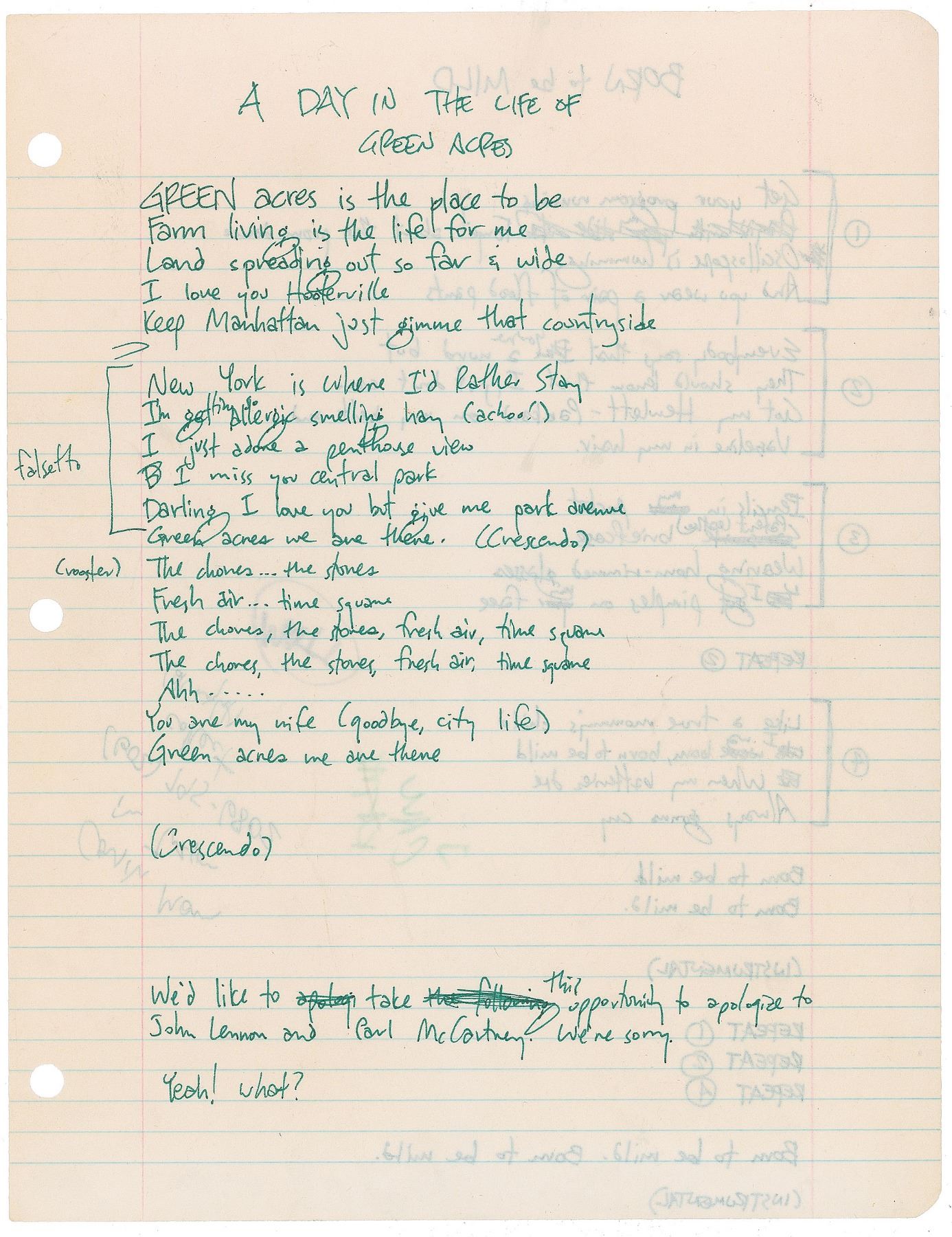 A sheet with lyrics for the song “A Day in the Life of Green Acres” on one side, and the other side featuring words for the song “Born to Be Mild” on the other; the “Green Acres” song is a parody of the Beatles hit ‘A Day in the Life’ from their Sgt. Pepper's Lonely Hearts Club Band album, with Yankovic writing at the end: “We’d like to take this opportunity to apologize to John Lennon and Paul McCartney. We’re sorry.” Yankovic made a point to recite this final line during live performances of ‘A Day in the Life of Green Acres.’