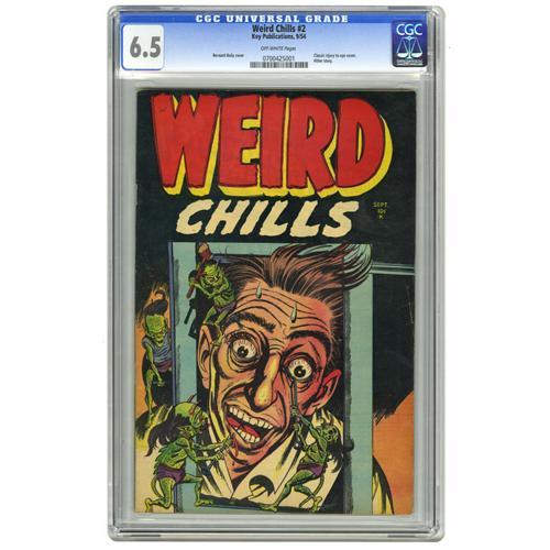 <B>Weird Chills #2 (Key Publications, 1954) CGC FN+ 6.5 Off-white pages.</B></I> It's pre-Code horror time, and here's a prime example of what people call the "injury-to-eye motif," on a Bernard Baily cover that Overstreet calls "extremely violent." There's a Hitler appearance inside the issue. Overstreet 2006 FN 6.0 value = $228; VF 8.0 value = $475. CGC census 3/06: 2 in 6.5, 7 higher.