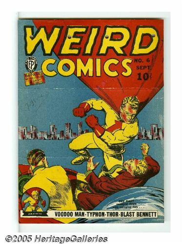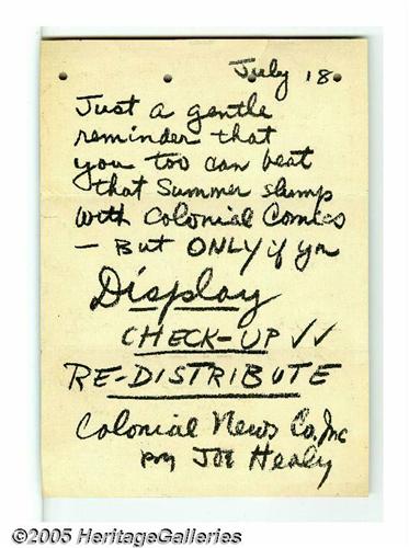 <B>Weird Comics #6 Promotional Cover Announcement (Fox Features Syndicate, 1940).</B></I> This rare promotional cover announcement features a message on the reverse reading, "Just a gentle reminder that you too can beat that Summer slump with Colonial Comics -- but only if you Display -- Check-up -- Re-Distribute." The distributor who originally received this announcement recorded the date "7-25-40" on the front in pencil. Like all the other announcements offered here, this one has two horizontal folds to facilitate mailing in a standard business envelope. There are four binder holes punched along the top, with a one-inch tear from the top edge to the hole in "E," and another short tear on the right edge just below the top crease; the condition is otherwise Excellent overall.