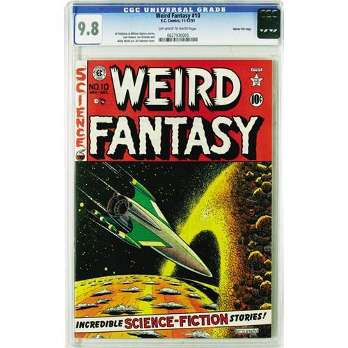 <B>Weird Fantasy #10 Gaines File pedigree 3/12 (EC, 1951) CGC NM/MT 9.8 Off-white to white pages.</B></I> Brilliant copy of this issue which features one of Al Feldstein's most striking covers. Interior art by Wally Wood (two stories), Jack Kamen, and Joe Orlando make this as close to perfect artistically as you could Fantasize! Overstreet 2006 NM- 9.2 value = $650. CGC census 3/06: 3 in 9.8, none higher.
