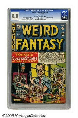<B>Weird Fantasy #13 (#1) (EC, 1950) CGC VF 8.0 Light tan to off-white pages.</B></I> What a change it was when EC introduced "a new trend in magazines" here, continuing the numbering from the bizarrely named <B>A Moon, A Girl... Romance</B></I>. This premiere issue has an Al Feldstein cover, plus interior art by Feldstein, Jack Kamen, Harvey Kurtzman, and the team of Harry Harrison and Wally Wood. Overstreet 2005 VF 8.0 value = $1,448. CGC census 6/05: 5 in 8.0, 7 higher.