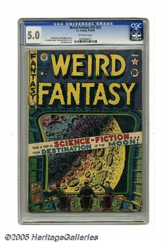 <B>Weird Fantasy #15 (#3) (EC, 1950) CGC VG/FN 5.0 Off-white pages.</B></I> Al Feldstein cover. Feldstein, Harvey Kurtzman, Jack Kamen, and Wally Wood art. Overstreet 2005 VG 4.0 value = $120; FN 6.0 value = $180. CGC census 3/05: 2 in 5.0, 6 higher.