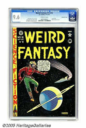 <B>Weird Fantasy #16 (#4) Gaines File pedigree (EC, 1950) CGC NM+ 9.6 Off-white pages.</B></I> Harvey Kurtzman's story in this issue from 1950 takes place in 1970. It predicts: "Television is now everywhere! Every country in the world, every home, every person, watches television!" In addition to that prophetic piece, the issue has an Al Feldstein cover, with interior art by Feldstein, Harvey Kurtzman, Jack Kamen, and Wally Wood. The issue was mentioned in <B>Seduction of the Innocent</B></I>, oddly enough not for any pierced eyeballs or the like, but for using the slangy contraction "we'da" for "we would have." Note that while CGC has certified this book as a Gaines File copy, no certificate accompanies this lot. Overstreet 2005 NM- 9.2 value = $870. CGC census 6/05: 1 in 9.6, 1 higher.