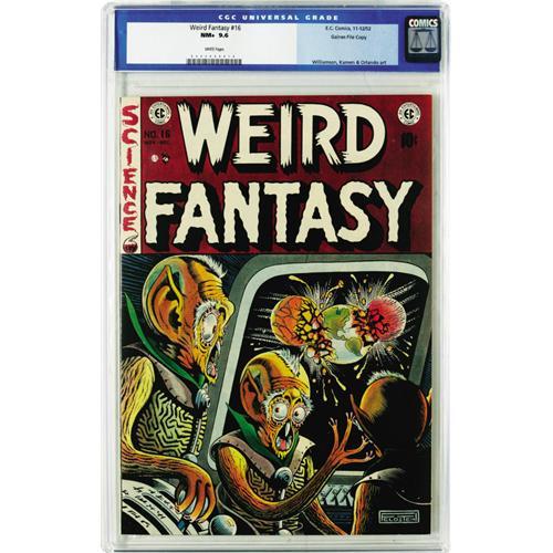 <B>Weird Fantasy #16 Gaines File pedigree 3/12 (EC, 1952) CGC NM+ 9.6 White pages.</B></I> Not only did this issue offer another stunning cover by Al Feldstein, and equally impressive interior art by Jack Kamen, Joe Orlando, and Al Williamson/Roy Krenkel, it managed to get cited in <B>Seduction of the Innocent</B></I>. Yesss! This issue's a bit tougher to find in the extra-high grades associated with so many of the Gaines File Copies -- just two have managed to earn this high of a grade from CGC to date. Overstreet 2006 NM- 9.2 value = $500. CGC census 3/06: 2 in 9.6, none higher.