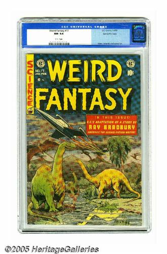 <B>Weird Fantasy #17 Gaines File pedigree 9/12 (EC, 1953) CGC NM 9.4 White pages.</B></I> The cover eye-candy of this issue comes from the creative talents of artist/writer/editor Al Feldstein; the effect made all the more powerful on this gorgeous copy, which bears the second highest grade CGC has awarded to date for issue #17. Al Williamson/Roy Krenkel, Bill Elder, Joe Orlando, and Wally Wood art. Overstreet 2005 NM- 9.2 value = $460. CGC census 7/05: 4 in 9.4, 1 higher.