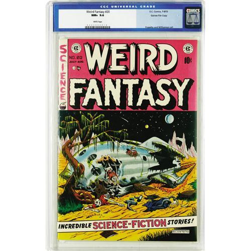 <B>Weird Fantasy #20 Gaines File pedigree 3/12 (EC, 1953) CGC NM+ 9.6 White pages.</B></I> Even with the breathtaking Gaines File Copies, white pages are a bonus. This beauty of a copy has them, along with a pristine Al Feldstein cover and very nearly the highest grade yet assigned by CGC for issue #20. John Severin/Bill Elder, Al Williamson/Frank Frazetta, Jack Kamen, and Joe Orlando did the art for interior stories, one of which was a Ray Bradbury story adaptation. Overstreet 2006 NM- 9.2 value = $550. CGC census 7/05: 1 in 9.6, 2 higher.