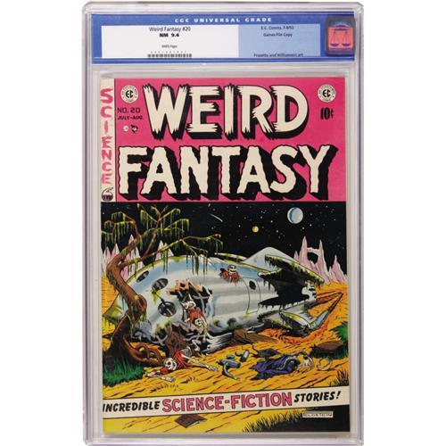 <B>Weird Fantasy #20 Gaines File pedigree 9/12 (EC, 1953) CGC NM 9.4 White pages.</B></I> Just a sensational copy, rife with color (love that hot-pink logo background!) and content (Feldstein at his horror/sci-fi best). Frank Frazetta, inked by Al Williamson, puts the exclamation point on this issue with his interior work. Overstreet 2006 NM- 9.2 value = $550. CGC census 10/06: 1 in 9.4, 3 higher.<BR><BR><b>Shipping:</b> Slabbed Comic (<a target="_blank" href="http://www.heritageauctions.com/common/shipping.php">view shipping information</a>)