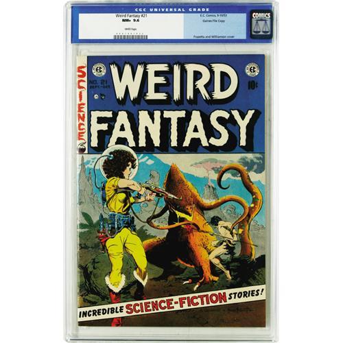 <B>Weird Fantasy #21 Gaines File pedigree 2/12 (EC, 1953) CGC NM+ 9.6 White pages.</B></I> This book has one of the more famous sci-fi comic book covers of the 1950's, drawn by Frank Frazetta and Al Williamson. Interior contributors include Williamson, Roy Krenkel, John Severin, Jack Kamen, and Joe Orlando. A beautiful issue with an important pedigree and the highest CGC grade for this issue to date. Overstreet 2006 NM- 9.2 value = $725. CGC census 3/06: 2 in 9.6, none higher.
