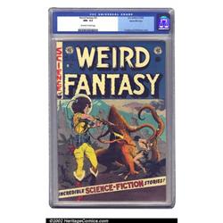 Weird Fantasy #21 Gaines File pedigree 3/12 (EC, 1953) CGC NM- 9.2 Off-white to white pages. Williamson and Frazetta team up on this fantastic cover. This copy has some of the sharpest corners you'll ever see, but it suffers from a tiny tear/crease at the top edge of the cover. Overall, a very attractive and collectible book from an important pedigree. Overstreet 2002 NM 9.4 value = $550. Important notice: We expect to be auctioning lots at the rate of 200-250 per hour. Sometimes eBay Premier live bid software cannot keep up with that pace, so we strongly recommend that you place a realistic proxy bid now as insurance to avoid disappointment. Also please note that all Heritage/CAA lots purchased through eBay Premier carry a 20% Buyer's Premium. Please make sure you read the Terms and Conditions.