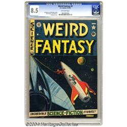 <B>Weird Fantasy #9 (EC, 1951) CGC VF+ 8.5 Off-white pages.</B></I> Great Al Feldstein cover showing risky zero-G maneuvers as spacemen cross from one ship to another on a thin cable. Interior art by Wally Wood, Jack Kamen, and Joe Orlando ensure that the contents in this issue are as good as the cover! Overstreet 2004 VF 8.0 value = $300; VF/NM 9.0 value = $430. <BR><BR><B>Important notice:</B> Heritage usually auctions material at the rate of 200-250 lots per hour. On some occasions eBay Live bid software or the Internet may not be able to keep up with the pace of the auction. We recommend placing a realistic absentee bid now as insurance to avoid disappointment. Occasionally the auctioneer may eliminate or reject an eBay Live bid, and the auctioneer may also reopen a lot after the close of the eBay live bidding (usually because we missed an audience bid), and may reject your bid even if it shows you as the winning bidder. By bidding via eBay Live, you agree that Heritage may award the lot to another bidder at its sole discretion under the circumstances described above or any other reasonable circumstances. Since eBay bids are not shown to us until we open the lot on the floor, we treat those bids just like floor bids. In most cases the floor responds before the eBay bid is presented to us, due to Internet lag time, so for consistency we have made it a policy that floor bids are always considered first over tie eBay live bids. Also please note that all Heritage lots purchased through eBay Live carry a 20% Buyer's Premium. Please make sure you read the Terms and Conditions before you bid. </span></font></tr></table></td></tr></table>
