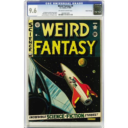 <B>Weird Fantasy #9 Gaines File pedigree 2/11 (EC, 1951) CGC NM+ 9.6 Off-white to white pages.</B></I> Al Feldstein produced a simple yet stunning sci-fi cover for this book. With the dark cover, high-grade issues are hard to come by. To date, this is the highest CGC grade given for this issue. Wally Wood, Jack Kamen, Marty Elkin, and Joe Orlando contribute to the interior art. A beautiful pedigree copy. Overstreet 2006 NM- 9.2 value = $650. CGC census 3/06: 3 in 9.6, none higher.