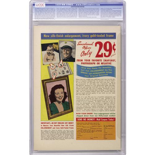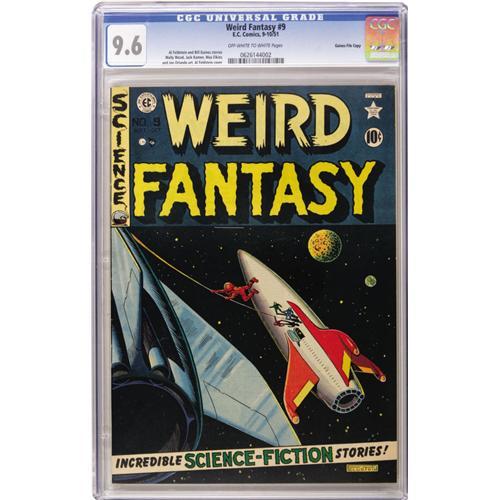 <B>Weird Fantasy #9 Gaines File pedigree 8/11 (EC, 1951) CGC NM+ 9.6 Off-white to white pages.</B></I> Al Feldstein is responsible for the stirring sci-fi cover here, stunning yet brilliant in its simplicity. The dark of outer space background means an issue that can be a challenge to find in high-grade. Well, except for the Gaines file copies, that is! No other copies of issue #9 have earned higher grades from CGC to date. Joe Orlando, Wally Wood, and Jack Kamen provide story art for this issue. Overstreet 2006 NM- 9.2 value = $650. CGC census 10/06: 3 in 9.6, none higher.<BR><BR><b>Shipping:</b> Slabbed Comic (<a target="_blank" href="http://www.heritageauctions.com/common/shipping.php">view shipping information</a>)