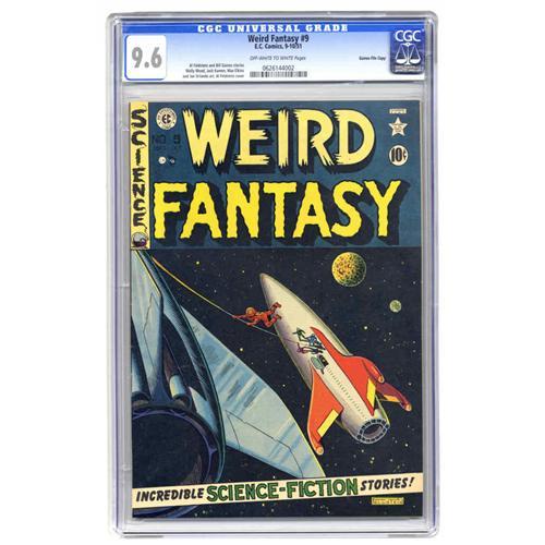 <B>Weird Fantasy #9 Gaines File pedigree 8/11 (EC, 1951) CGC NM+ 9.6 Off-white to white pages.</B></I> An Al Feldstein illustration of a rocket ship floating in inky-black space adorns this sparkling cover. Wally Wood, Jack Kamen, Marty Elkin, and Joe Orlando art is featured inside. Overstreet 2005 NM- 9.2 value = $595. CGC census 12/05: 3 in 9.6, none higher.