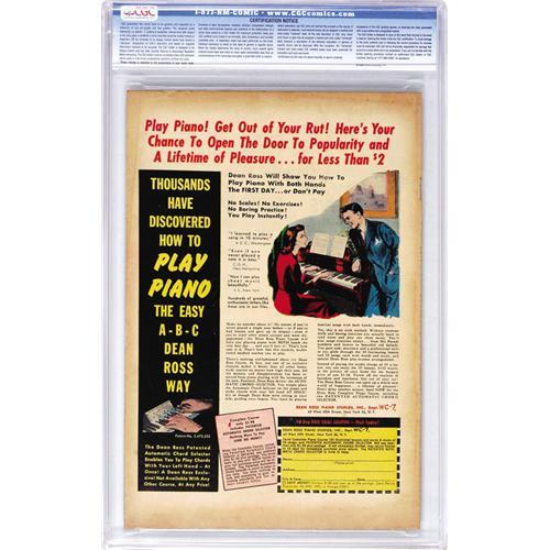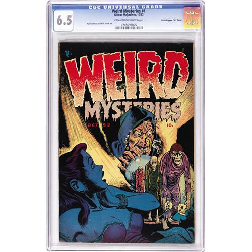 <B>Weird Mysteries #1 Davis Crippen ("D" Copy) pedigree (Gilmor, 1952) CGC FN+ 6.5 Cream to off-white pages.</B></I> We thought we recognized Basil Wolverton's style on the monsters at the lower right of this cover, and indeed, Overstreet notes that the image is taken from Wolverton's art for <B>Weird Tales of the Future</B></I> (published by SPM, which is the same company as Gilmor and Aragon). Try finding a nicer copy of this black-cover pre-Code horror book! Overstreet 2006 FN 6.0 value = $267; VF 8.0 value = $556. CGC census 7/06: 1 in 6.5, 1 higher. <I>From the Crippen Collection.</B></I> <BR><BR><B>Important notice:</B> Heritage usually auctions material at the rate of 200-250 lots per hour. On some occasions eBay Live bid software or the Internet may not be able to keep up with the pace of the auction. We recommend placing a realistic absentee bid now as insurance to avoid disappointment. Occasionally the auctioneer may eliminate or reject an eBay Live bid, and the auctioneer may also reopen a lot after the close of the eBay live bidding (usually because we missed an audience bid), and may reject your bid even if it shows you as the winning bidder. By bidding via eBay Live, you agree that Heritage may award the lot to another bidder at its sole discretion under the circumstances described above or any other reasonable circumstances. Since eBay bids are not shown to us until we open the lot on the floor, we treat those bids just like floor bids. In most cases the floor responds before the eBay bid is presented to us, due to Internet lag time, so for consistency we have made it a policy that floor bids are always considered first over tie eBay live bids. Also please note that all Heritage lots purchased through eBay Live carry a 22.5% Buyer's Premium. Please make sure you read the Terms and Conditions before you bid. This lot is being auctioned in conjunction with a live floor auction by Heritage Auction Galleries. All final auction and invoice information will be supplied by Heritage Auction Galleries, and all other information should be considered preliminary. Lot:41001 <BR><BR><B>Winning Notification and Billing:</B> After the FINAL session in this auction is complete, Heritage will send e-mail and snail mail invoices. This process normally takes several days. All final auction and invoice information will be supplied by Heritage Auction Galleries, and all other information should be considered preliminary. <BR><BR>This auction will be conducted on a live auction floor and over the Internet through eBay Live. If you choose to place an absentee bid, please take a moment to <font color='#0000ff'><u><a href='http://pages.ebay.com/liveauctions/help/before/laabsentee.html'>learn how eBay Live absentee bidding works</a></u></font><font color='#000000'>