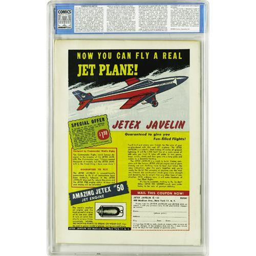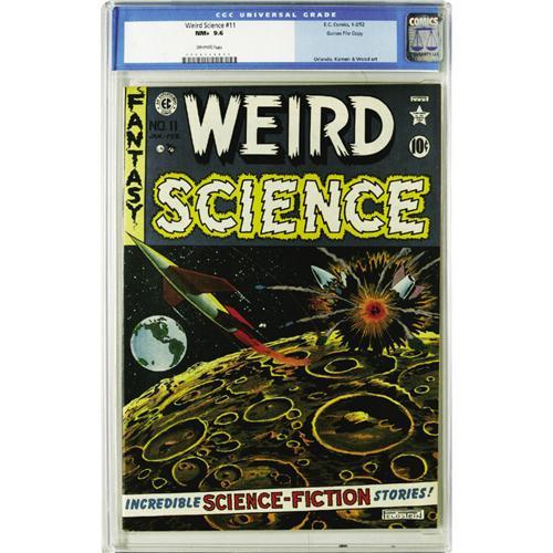 <B>Weird Science #11 Gaines File pedigree 9/12 (EC, 1952) CGC NM+ 9.6 Off-white pages.</B></I> Al Feldstein's rocket ship-over-a-cratered-moonscape cover makes this one of the most memorable EC science-fiction covers of all. Jack Kamen, Joe Orlando, and Wally Wood provided the interior art for this issue, which also features a biography of Kamen. Overstreet 2006 NM- 9.2 value = $525. CGC census 6/06: 1 in 9.6, 3 higher. <BR><BR><B>Important notice:</B> Heritage usually auctions material at the rate of 200-250 lots per hour. On some occasions eBay Live bid software or the Internet may not be able to keep up with the pace of the auction. We recommend placing a realistic absentee bid now as insurance to avoid disappointment. Occasionally the auctioneer may eliminate or reject an eBay Live bid, and the auctioneer may also reopen a lot after the close of the eBay live bidding (usually because we missed an audience bid), and may reject your bid even if it shows you as the winning bidder. By bidding via eBay Live, you agree that Heritage may award the lot to another bidder at its sole discretion under the circumstances described above or any other reasonable circumstances. Since eBay bids are not shown to us until we open the lot on the floor, we treat those bids just like floor bids. In most cases the floor responds before the eBay bid is presented to us, due to Internet lag time, so for consistency we have made it a policy that floor bids are always considered first over tie eBay live bids. Also please note that all Heritage lots purchased through eBay Live carry a 22.5% Buyer's Premium. Please make sure you read the Terms and Conditions before you bid. This lot is being auctioned in conjunction with a live floor auction by Heritage Auction Galleries. All final auction and invoice information will be supplied by Heritage Auction Galleries, and all other information should be considered preliminary. Lot:41001 <BR><BR><B>Winning Notification and Billing:</B> After the FINAL session in this auction is complete, Heritage will send e-mail and snail mail invoices. This process normally takes several days. All final auction and invoice information will be supplied by Heritage Auction Galleries, and all other information should be considered preliminary. <BR><BR>This auction will be conducted on a live auction floor and over the Internet through eBay Live. If you choose to place an absentee bid, please take a moment to <font color='#0000ff'><u><a href='http://pages.ebay.com/liveauctions/help/before/laabsentee.html'>learn how eBay Live absentee bidding works</a></u></font><font color='#000000'>