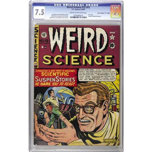 <B>Weird Science #12 (#1) Davis Crippen ("D" Copy) pedigree (EC, 1950) CGC VF- 7.5 Cream to off-white pages.</B></I> Al Feldstein drew the cover for this first issue. There's interior art by Feldstein, Harvey Kurtzman, Jack Kamen, and the team of Harry Harrison and Wally Wood. The latter story parodies the EC staff. Overstreet 2006 VF 8.0 value = $1,504. CGC census 9/06: 1 in 7.5, 14 higher. <I>From the Crippen Collection.</B></I><BR><BR><b>Shipping:</b> Slabbed Comic (<a target="_blank" href="http://www.heritageauctions.com/common/shipping.php">view shipping information</a>)