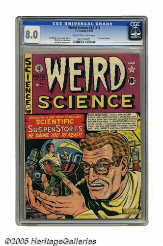<B>Weird Science #12 (#1) (EC, 1950) CGC VF 8.0 Cream to off-white pages.</B></I> A memorable cover by Al Feldstein previewed a classic story written by Harvey Kurtzman, who also provided the story art. Artists Feldstein, Wally Wood, and Jack Kamen contributed art to this issue, the first of the title. Overstreet 2005 VF 8.0 value = $1,448. CGC census 5/05: 3 in 8.0, 10 higher.