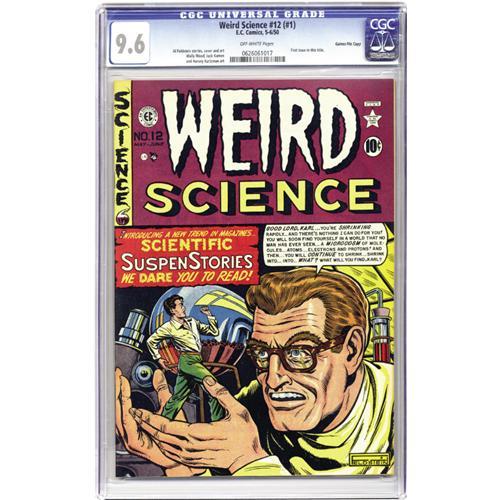 <B>Weird Science #12 (#1) Gaines File pedigree 4/9 (EC, 1950) CGC NM+ 9.6 Off-white pages.</B></I> Here's a pedigreed copy of the very first issue of this important title, in near-perfect condition. Al Feldstein's cover sets the tone, and interior art by Feldstein, Harvey Kurtzman (the classic story "Lost in the Microcosm"), Jack Kamen, and the team of Harry Harrison and Wally Wood keep things flying high. The Harrison/Wood story "Dream of Doom" parodies the entire EC staff. Overstreet 2006 NM- 9.2 value = $3,000. CGC census 05/06: 2 in 9.6, none higher.