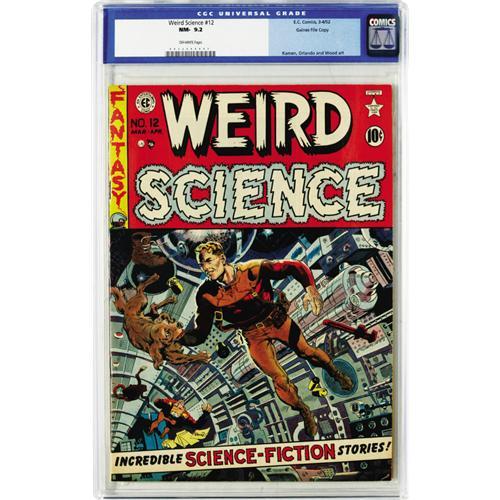<B>Weird Science #12 Gaines File pedigree 3/11 (EC, 1952) CGC NM- 9.2 Off-white pages.</B></I> Wally Wood presents us with a great zero-G cover on this book. The floating dog is priceless. There is also interior artwork by Wood (two stories), Jack Kamen and Joe Orlando. A beautiful copy with rich colors, a tight spine, and an important pedigree. Overstreet 2006 NM- 9.2 value = $525. CGC census 3/06: 2 in 9.2, 2 higher.