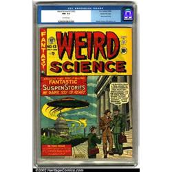 Weird Science #13 (#2) Gaines File pedigree 7/10 (EC, 1950). A classic "flying saucers over Washington" cover by Al Feldstein highlights the second issue of this classic title. Stories by Harvey Kurtzman, Jack Kamen and Wally Wood round out this lovely gem of a comic from publisher Bill Gaines' personal collection. CGC NM- 9.2 Off-white pages. Overstreet 2001 NM 9.4 value = $900.  Important notice: We expect to be auctioning lots at the rate of 200-250 per hour. Sometimes eBay Premier live bid software cannot keep up with that pace, so we strongly recommend that you place a realistic proxy bid now as insurance to avoid disappointment. Also please note that all Heritage/CAA lots purchased through eBay Premier carry a 20% Buyer's Premium.