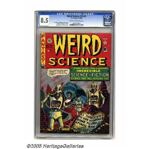 <B>Weird Science #14 (#3) (EC, 1950) CGC VF+ 8.5 Cream to off-white pages.</B></I> Post-apocalyptic scenarios were revisited several times by EC's creators, with a powerful story the inevitable result. This time, it's Al Feldstein drawing the story (as well as the accompanying cover scene). This third issue also includes art by Harvey Kurtzman, Harry Harrison, and Jack Kamen. Overstreet 2005 VF 8.0 value = $630; VF/NM 9.0 value = $928. CGC census 9/05: 1 in 8.5, 6 higher. <BR><BR><B>Important notice:</B> Heritage usually auctions material at the rate of 200-250 lots per hour. On some occasions eBay Live bid software or the Internet may not be able to keep up with the pace of the auction. We recommend placing a realistic absentee bid now as insurance to avoid disappointment. Occasionally the auctioneer may eliminate or reject an eBay Live bid, and the auctioneer may also reopen a lot after the close of the eBay live bidding (usually because we missed an audience bid), and may reject your bid even if it shows you as the winning bidder. By bidding via eBay Live, you agree that Heritage may award the lot to another bidder at its sole discretion under the circumstances described above or any other reasonable circumstances. Since eBay bids are not shown to us until we open the lot on the floor, we treat those bids just like floor bids. In most cases the floor responds before the eBay bid is presented to us, due to Internet lag time, so for consistency we have made it a policy that floor bids are always considered first over tie eBay live bids. Also please note that all Heritage lots purchased through eBay Live carry a 20% Buyer's Premium. Please make sure you read the Terms and Conditions before you bid. This lot is being auctioned in conjunction with a live floor auction by Heritage Galleries & Auctioneers. All final auction and invoice information will be supplied by Heritage Galleries & Auctioneers, and all other information should be considered preliminary. Lot:3159 <