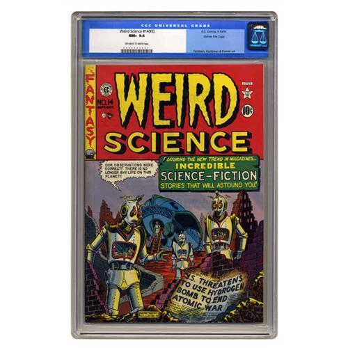 <B>Weird Science #14 (#3) Gaines File pedigree 8/11 (EC, 1950) CGC NM+ 9.6 Off-white to white pages.</B></I> EC loved post-apocalyptic scenarios, and the stories in that vein tended to be powerful ones indeed. This time, it's Al Feldstein drawing the story (as well as the accompanying cover scene). This issue also includes art by Harvey Kurtzman, Harry Harrison, and Jack Kamen. Overstreet 2005 NM- 9.2 value = $1,225. CGC census 12/05: 4 in 9.6, 1 higher.