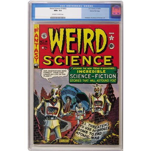 <B>Weird Science #14 (#3) Gaines File pedigree 8/11 (EC, 1950) CGC NM+ 9.6 Off-white to white pages.</B></I> This third issue's end-of-the-world cover is classic Feldstein all the way. It is also a Gaines file copy in 9.6, and has art by Harvey Kurtzman and Jack Kamen. ECs are widely regarded as the best of the best, and this one tops the list as one of the best. This book is beautiful in every way; it has a flawless spine, four corners that are so sharp you could poke your eye out, and white pages. Overstreet 2006 NM- 9.2 value = $1,300. CGC census 10/06: 4 in 9.6, 1 higher.<BR><BR><b>Shipping:</b> Slabbed Comic (<a target="_blank" href="http://www.heritageauctions.com/common/shipping.php">view shipping information</a>)