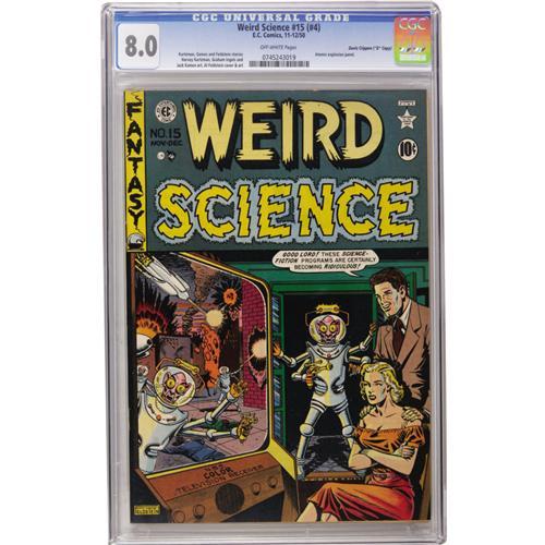 <B>Weird Science #15 (#4) Davis Crippen ("D" Copy) pedigree (EC, 1950) CGC VF 8.0 Off-white pages.</B></I> Al Feldstein supplied this issue's alien invasion cover. The interior artists are Feldstein, Harvey Kurtzman, Jack Kamen, and Graham Ingels. Overstreet 2006 VF 8.0 value = $605. CGC census 9/06: 1 in 8.0, 8 higher. <I>From the Crippen Collection.</B></I><BR><BR><b>Shipping:</b> Slabbed Comic (<a target="_blank" href="http://www.heritageauctions.com/common/shipping.php">view shipping information</a>)