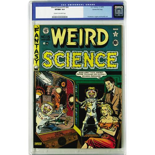 <B>Weird Science 15 (#4) Gaines File pedigree 4/9 (EC, 1950) CGC VF/NM 9.0 Cream to off-white pages.</B></I> The Al Feldstein "War of the Worlds" cover story was just the type of levity America needed during the apprehensive days of the Korean War. Feldstein, Harvey Kurtzman, Jack Kamen, and Graham Ingels furnished the story art. Overstreet 2006 VF/NM 9.0 value = $908; NM- 9.2 value = $1,210. CGC census 3/06: 3 in 9.0, 4 higher.