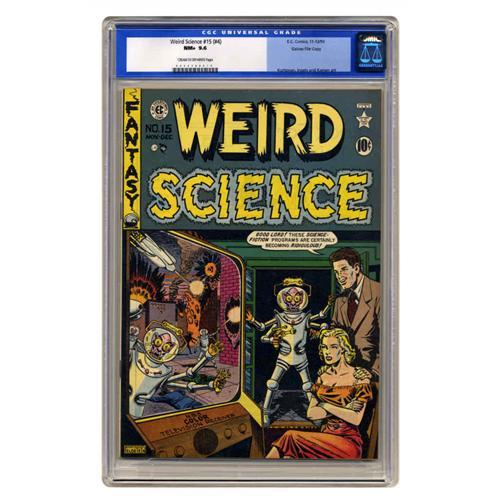 <B>Weird Science #15 (#4) Gaines File pedigree 7/9 (EC, 1950) CGC NM+ 9.6 Cream to off-white pages.</B></I> It's a "War of the Worlds" takeoff, featuring the Orson Welles-like "Carson Walls." But it wouldn't be an EC tale without a horrifying twist... Al Feldstein drew that story as well as the cover. This issue is also notable for having the only science fiction story that horror specialist Graham Ingels ever drew for EC. Also included are stories drawn by Harvey Kurtzman and Jack Kamen. No copy of this issue has been graded higher by CGC to date. Overstreet 2005 NM- 9.2 value = $1,125. CGC census 12/05: 4 in 9.6, none higher.
