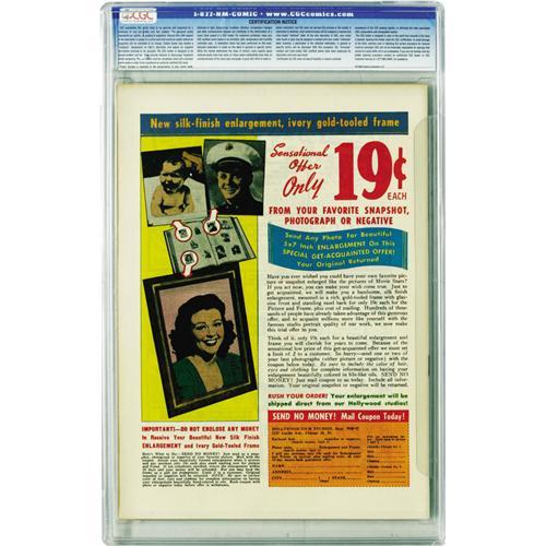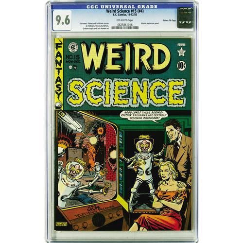 <B>Weird Science 15 (#4) Gaines File pedigree (EC, 1950) CGC NM+ 9.6 Off-white pages.</B></I> Everyone's favorite, the atomic explosion panel is included in this early issue, a part of a "War of the Worlds" story by Al Feldstein, who previews the story on the cover. Addition interior artists include Harvey Kurtzman, Jack Kamen, and Graham Ingels. This copy currently boasts the highest grade that CGC has awarded for the issue. While CGC has certified this as a Gaines File Copy, no certificate accompanies the book. Overstreet 2006 NM- 9.2 value = $1,210. CGC census 3/06: 3 in 9.6, none higher.