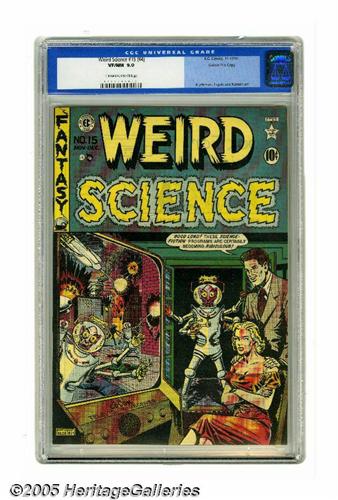 <B>Weird Science #15 (#4) Gaines File pedigree (EC, 1950) CGC VF/NM 9.0 Cream to off-white pages.</B></I> Al Feldstein did a memorable takeoff on "War of the Worlds" here, featuring radio personality "Carson Walls." But it wouldn't be an EC tale without a horrifying twist... This issue is also notable for having the only science fiction story that Ghastly Graham Ingels ever drew for EC. Also included are stories by Harvey Kurtzman and Jack Kamen. While CGC has certified this issue as a Gaines File copy, no certificate accompanies this lot. Overstreet 2005 VF/NM 9.0 value = $855; NM- 9.2 value = $1,125. CGC census 7/05: 3 in 9.0, 6 higher.