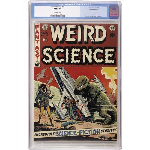 <B>Weird Science #15 Gaines File pedigree 7/12 (EC, 1952) CGC NM+ 9.6 Off-white pages.</B></I> A classic Wally Wood dinosaur cover highlights this fabulous EC issue, with stunning interior artwork by Wood, Al Williamson, Graham Ingels, and Jack Kamen. A lovely copy from the personal collection of Bill Gaines, you'll be hard-pressed to find any defects on this beauty. To date, no other copies of this issue have been graded higher by CGC. Overstreet 2006 NM- 9.2 value = $560. CGC census 10/06: 3 in 9.6, none higher.<BR><BR><b>Shipping:</b> Slabbed Comic (<a target="_blank" href="http://www.heritageauctions.com/common/shipping.php">view shipping information</a>)
