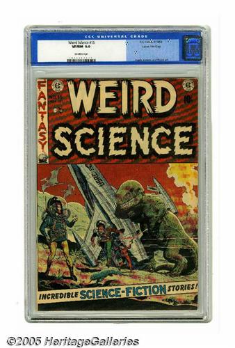 <B>Weird Science #15 Gaines File pedigree (EC, 1952) CGC VF/NM 9.0 Off-white pages.</B></I> A classic Wally Wood dinosaur cover highlights this fabulous EC issue, with stunning interior artwork by Wood, Al Williamson, Graham Ingels, and Jack Kamen. A lovely copy from the personal collection of Bill Gaines. While CGC has certified this issue as a Gaines File copy, no certificate accompanies this lot. Overstreet 2005 VF/NM 9.0 value = $395; NM- 9.2 value = $520. CGC census 7/05: 3 in 9.0, 6 higher.